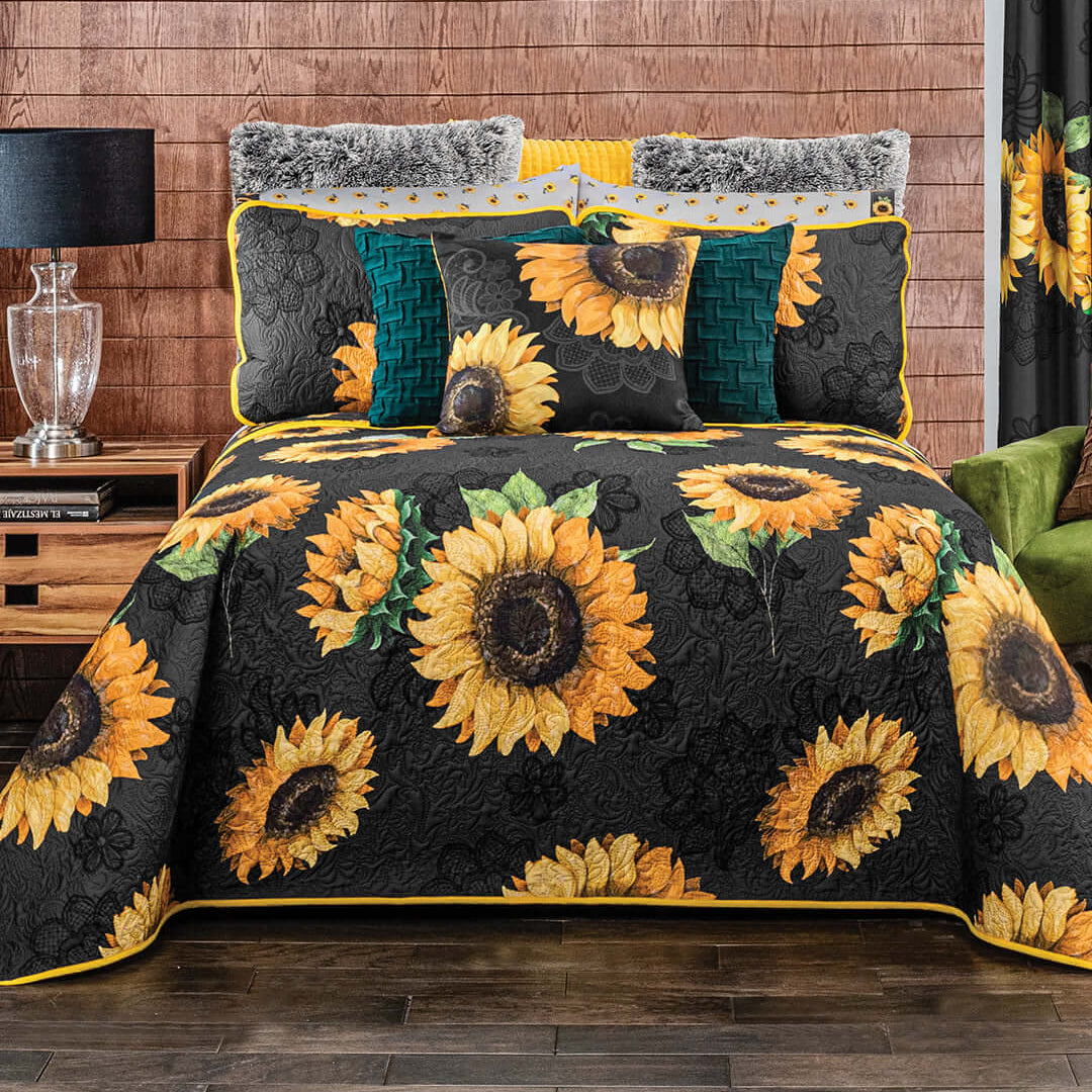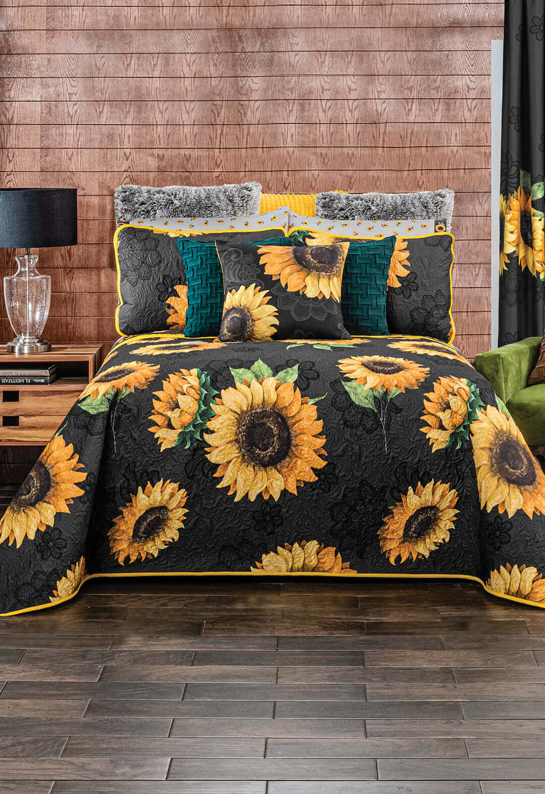 El coordinado de Edredon Amarelo, es un impactante y llamativo juego con diseño floral y reversible en color amarillo y capitonado sin hilos, incluye fundas decorativas, cojin y juego de sabanas