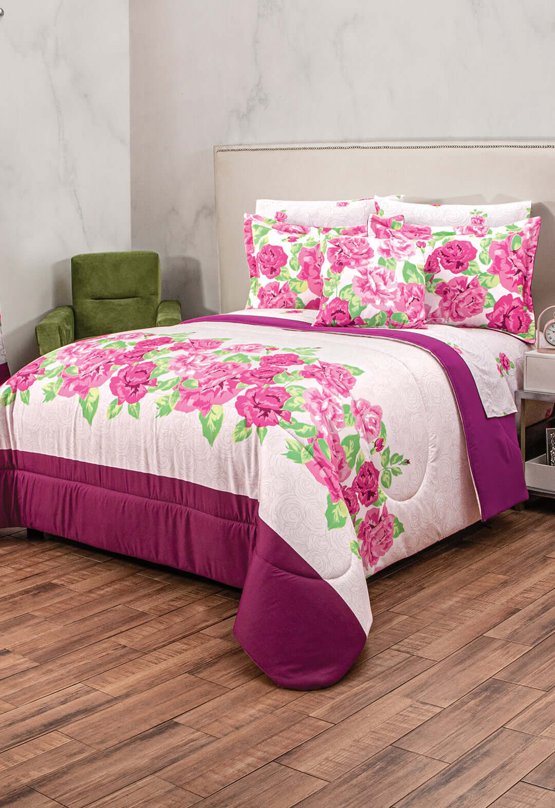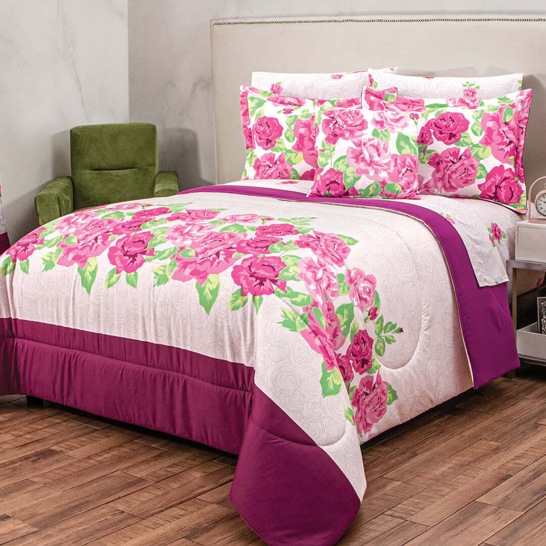 El coordinado de Edredon Eleonor es un completo e impactante juego reversible en color morado que incuye un hermoso juego de sabanas que combinan perfecto y realzaran la belleza de tu habitacion, ademas tienes la posibilidad de combinarlo con las cortinas Eleonor .