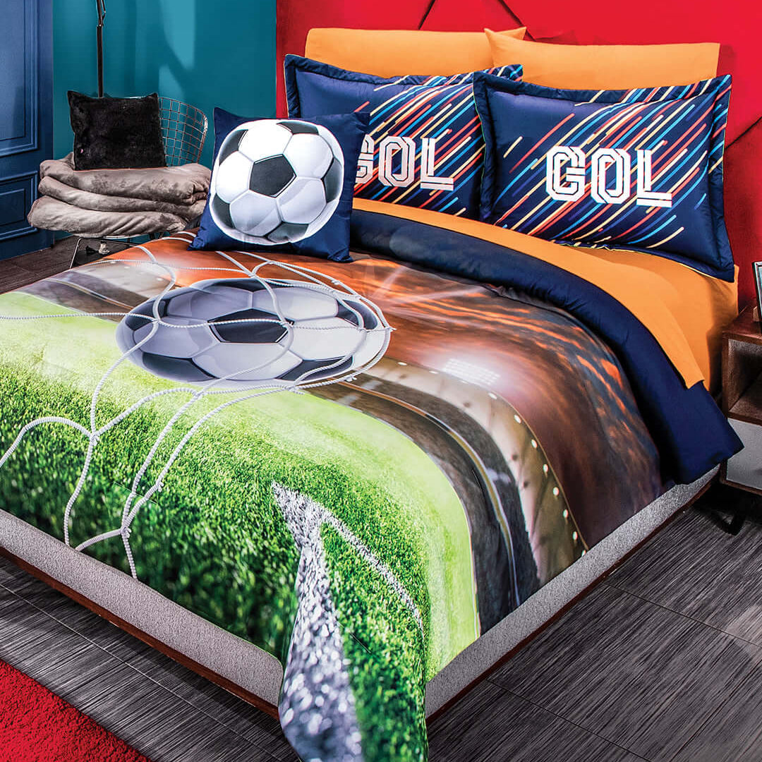 El Juego de Edredon Gol, es super divertido, comodo y calientito, es ideal para la habitacion del mas pequeño y travieso de casa. Es reversible e incluye Fundas y Cojin.