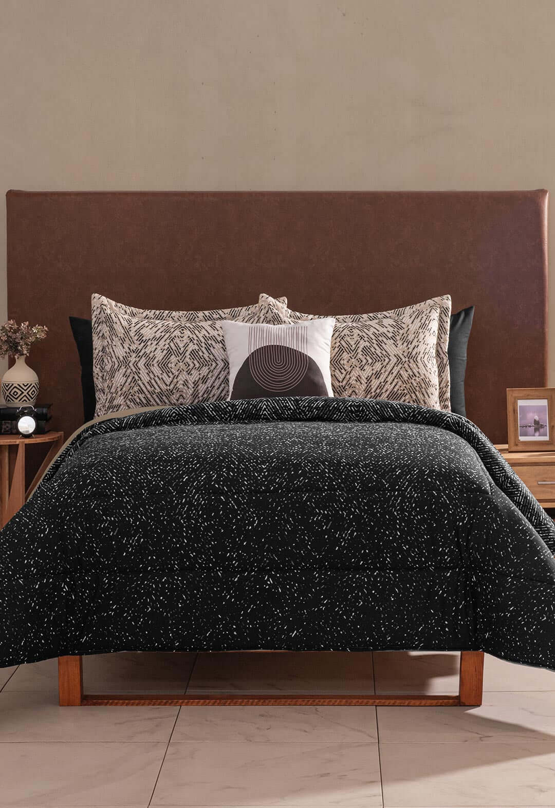Juego de Edredon Zurich con un hermoso diseño color negro, lo hace encantador, es de facil lavado en casa e incluye fundas decorativas.