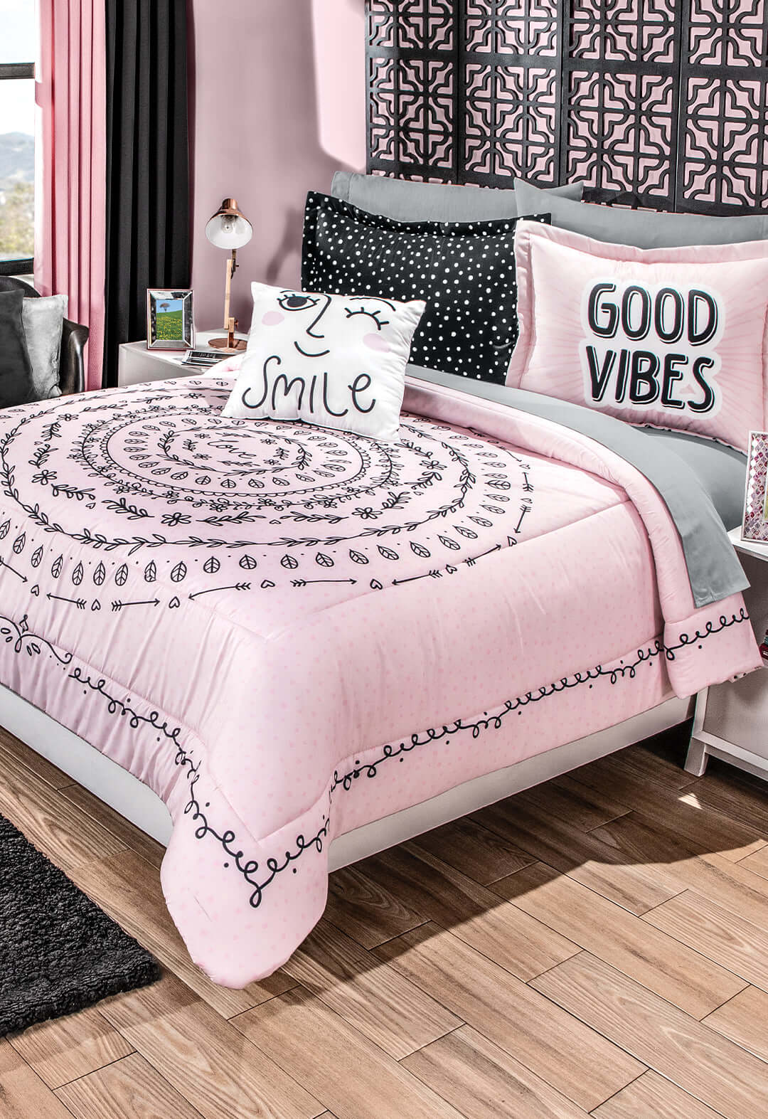 El Juego de Edredon Love es jovial, versatil y femenino, sus colores contrastan y combinan perfecto con el cojin con diseño, sonreiras siempre al entrar a tu habitacion.